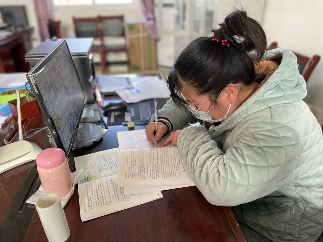 在村委会当志愿者的王苗利用空隙时间自学。汪海霞摄