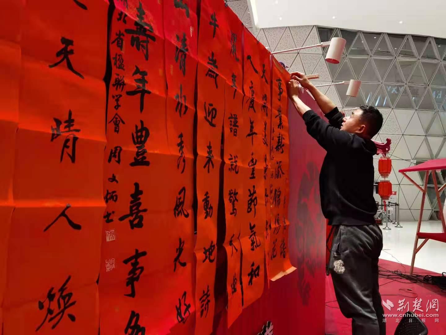 一个半小时直播结束时,现场书法家们创作的春联已经挂得满满当当,在宜昌、黄冈和襄阳分会场,也上演了同样的场景。这些春联和福字墨迹干透后,将和前期征集的一万余幅作品一道送进千家万户。