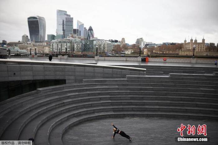 当地时间1月5日,英国采取了第三次严格性封锁措施,伦敦街头行人稀少。图为泰晤士河南岸,一名女子在锻炼身体。