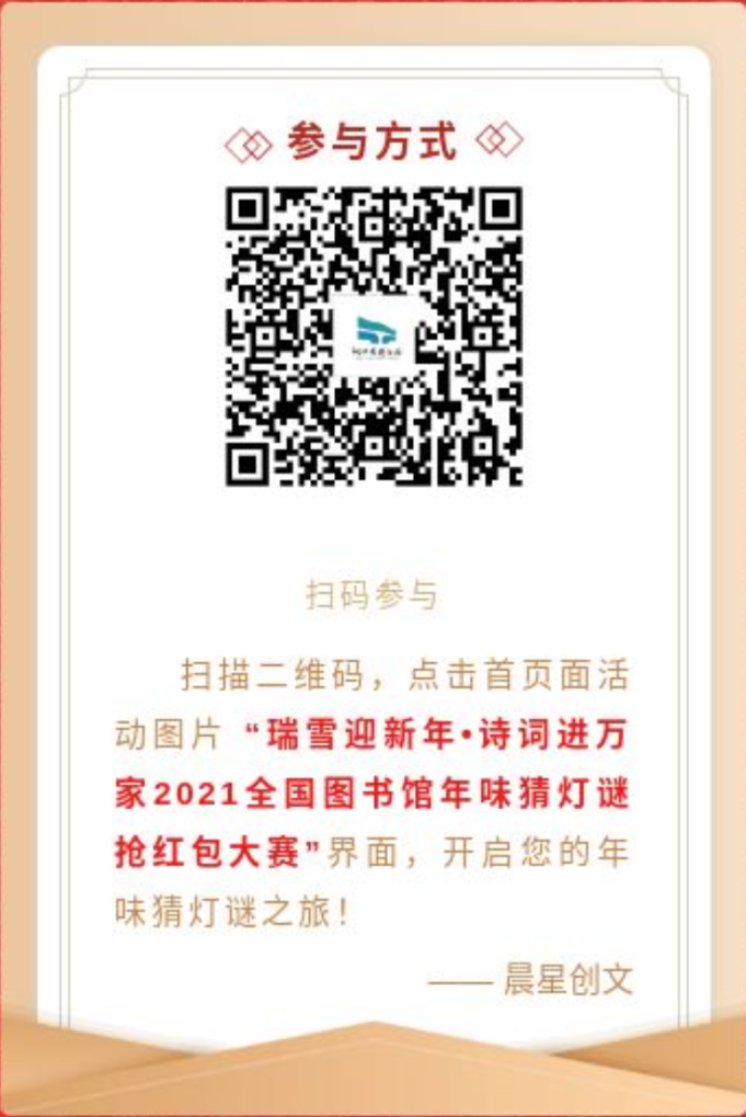 灯谜活动2021年2月6日上线至2月26日结束。扫描二维码,点击首页面活动图片“瑞雪迎新年诗词进万家 年味猜灯谜抢红包大赛”,开启您的年味猜灯谜之旅吧!