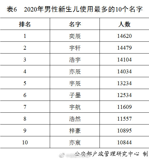 2020年出生并已经进行户籍登记的男性新生儿中,使用频率最高的10个名字依次为:“奕辰”“宇轩”“浩宇”“亦辰”“宇辰”“子墨”“宇航”“浩然”“梓豪”“亦宸”。与2019年相比,“奕辰”首次入围并登顶榜首,成为男性新生儿父母起名的首选,“亦辰”“宇辰”“亦宸”也进入前十。