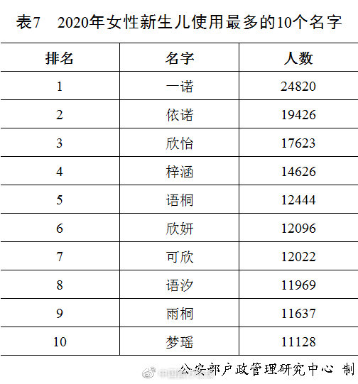 2020年出生并已经进行户籍登记的女性新生儿中,使用频率最高的10个名字依次为:“一诺”“依诺”“欣怡”“梓涵”“语桐”“欣妍”“可欣”“语汐”“雨桐”“梦瑶”。与2019年相比,“一诺”“依诺”“欣怡”依旧位列三甲,“语桐”“可欣”“语汐”“梦瑶”进入前十。