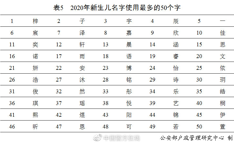 2020年出生并已经进行户籍登记的新生儿名字中,使用频率最高的50个字依次为“梓”“子”“宇”“辰”“一”等。与2019年相比,“玥”“伊”“昕”“可”等字受到新生儿父母的青睐。