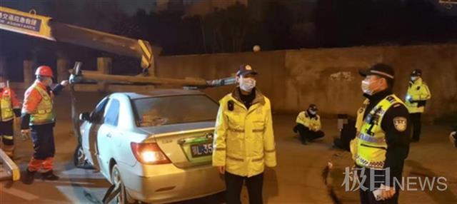 正月初二夜晚8时许,洪山区交通大队快骑机动队在青郑高速收费站检查点开展专项整治时,一辆号牌为鄂L3****的轿车驶出收费站,突然强行冲岗加速逃走。民警立即追赶、拦截,同时喊话令其停车。