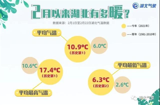 全省来看,2月以来暖到破纪录了。气象部门统计数据显示,今年2月以来,湖北的平均气温及平均最高气温均为历史同期第一,平均低温也居历史同期第二:全省2月1日-22日平均气温达到10.9℃,较常年偏高近5℃;让大家感到惊异的最高气温,偏高非常明显,平均达到17.4℃,较常年偏高6.8℃,换句话说,常年此时平均最高气温也就在11℃左右的水平;平均低温6.3℃,常年只有2.6℃。