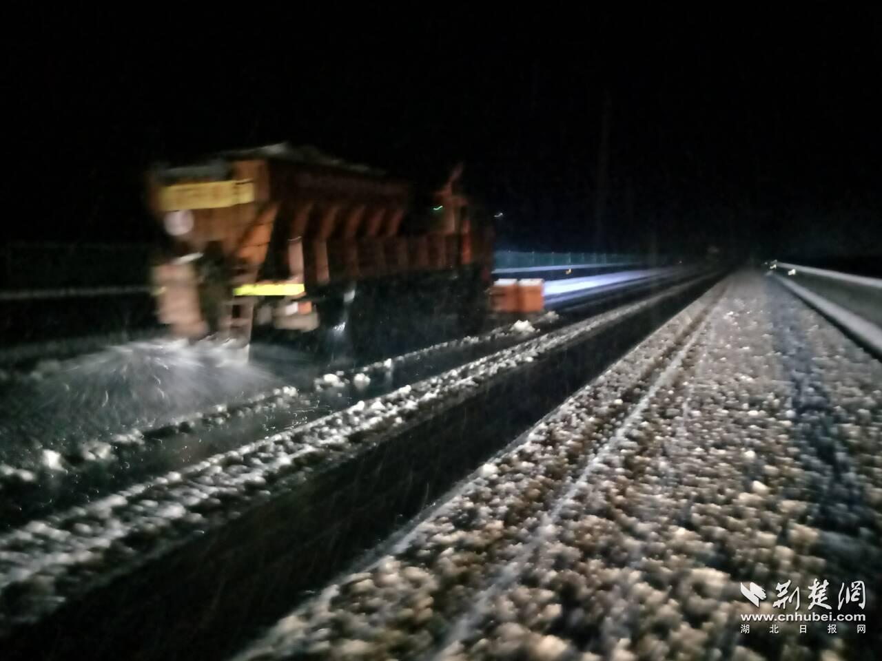 荆楚网(湖北日报网)讯(通讯员金伟忠、宫正)2月25日18时左右,湖北省鄂西北地区出现大范围雨雪天气,致使麻安高速宜保、谷竹和呼北高速郧十、十房等全长547公里路段路面形成积雪,湖北交投鄂西北高速公路运营管理有限公司第一时间启动应急预案,紧急联合高警、路政、养护等部门开展除雪保畅工作,确保山区人民群众安全快捷畅行高速公路。