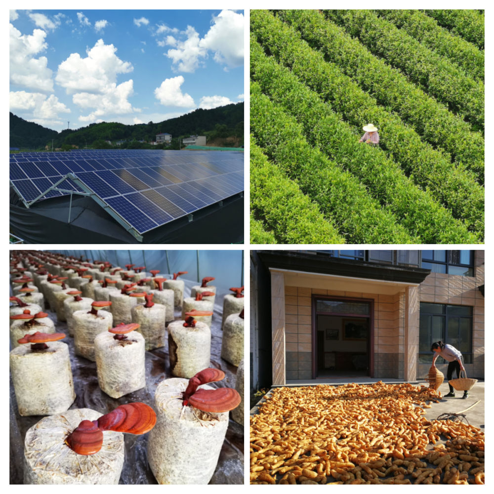 拼版照片:左上图为大湾村中的光伏电站。左下图为光伏板下种植的灵芝。右上图为大湾村茶园。右下图为大湾村村民种植的中药材。(新华社记者陈诺 摄)