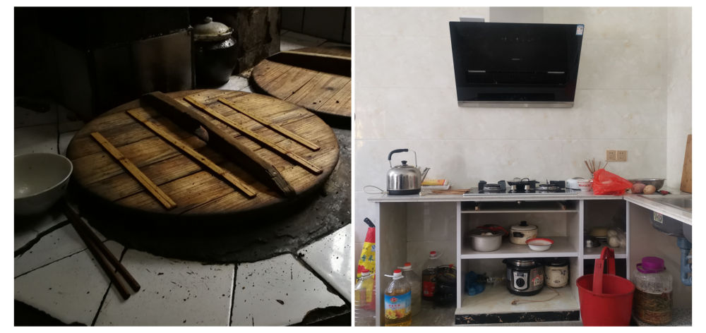 拼版照片:左图为2017年8月29日,记者在一户农家中拍摄的土灶台。右图为2020年4月3日,记者在一户农家中拍摄的新灶台。(新华社记者陈诺 摄)