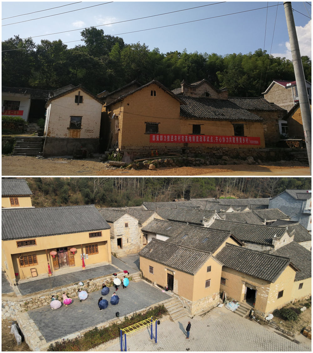拼版照片:上图为2017年7月26日,记者拍摄的大湾村老宅。下图为2020年12月29日,修旧如旧的老宅门口,大湾村民在排练舞蹈。(新华社记者陈诺 摄)
