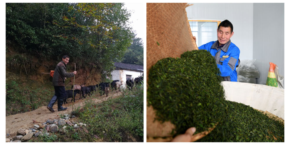 拼版照片:左图为2017年10月17日,陈泽申手持木棍,在家门口的山坡上赶羊(新华社记者陈诺 摄)右图为2020年4月16日,陈泽申在大湾村茶产业扶贫基地里加工春茶。(新华社记者刘军喜 摄)