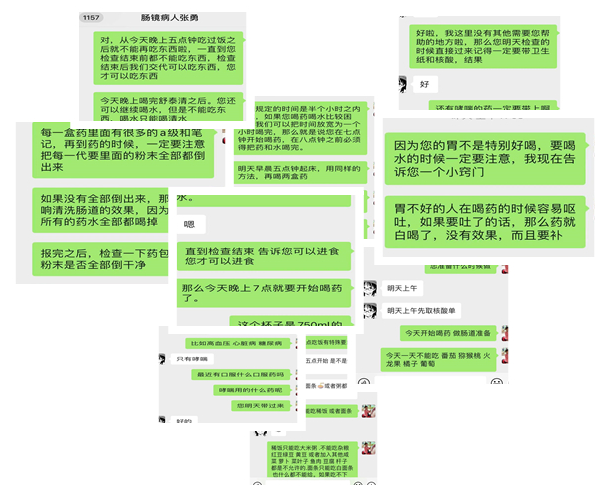 程汉英护士明白这是昨天预约肠镜的一位聋哑人患者张女士来了,立刻上前用手机打字询问她肠道准备是否完成,哮喘药是否随身携带,张女士点头,拿出手机打开聊天记录,只见密密麻麻的聊天记录全是昨天龚洁护士对她的叮嘱,如何喝肠道准备的药物,饮食方面的注意事项,询问病史,原来患者患有哮喘,为了避免肠镜过程中哮喘发作,特意强调要将哮喘药物一同带过来。