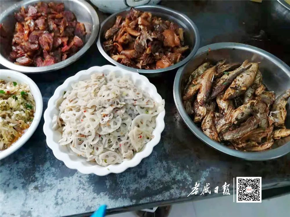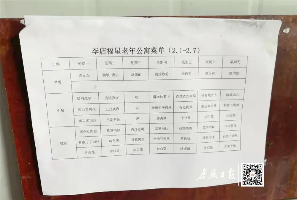 饭菜的阵阵香味吸引记者走进厨房,原来三位厨师正在准备当日中午的年饭:粉蒸肉、卤鸡蛋、炒藕片、烧鸡块、油炸小鱼、滑肉炖萝卜等,十几道热气腾腾的佳肴已准备完毕。厨房门口挂着每周菜谱正餐两荤一素,每天不重样。