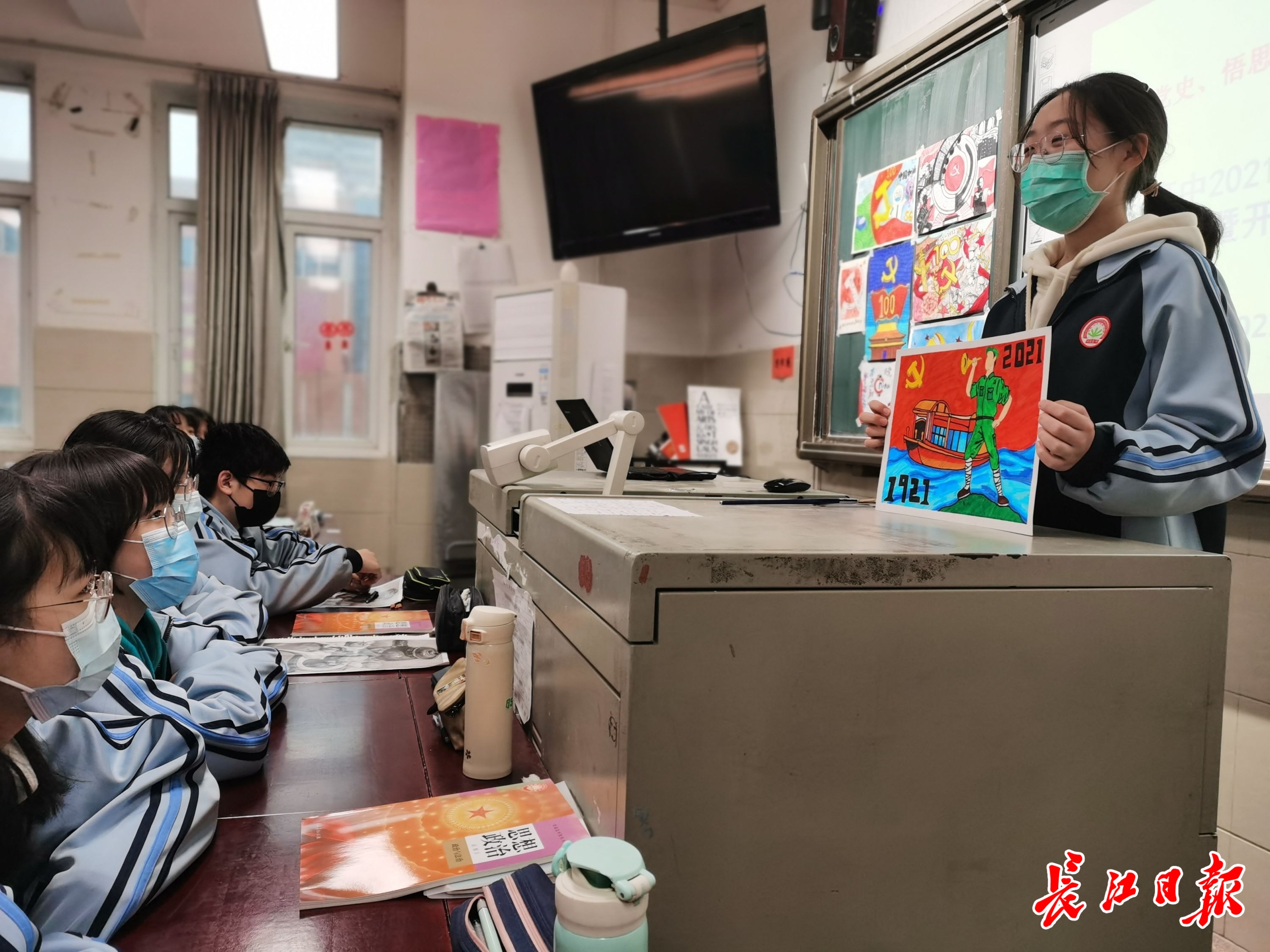 该校高一(2)班学生边歆蕊通过自己手绘的一幅画讲述“红船的故事”。记者向洁 摄