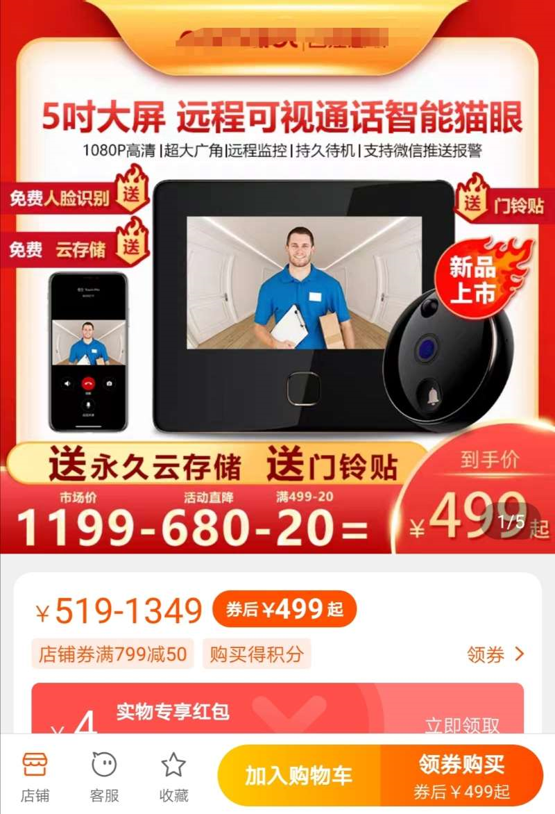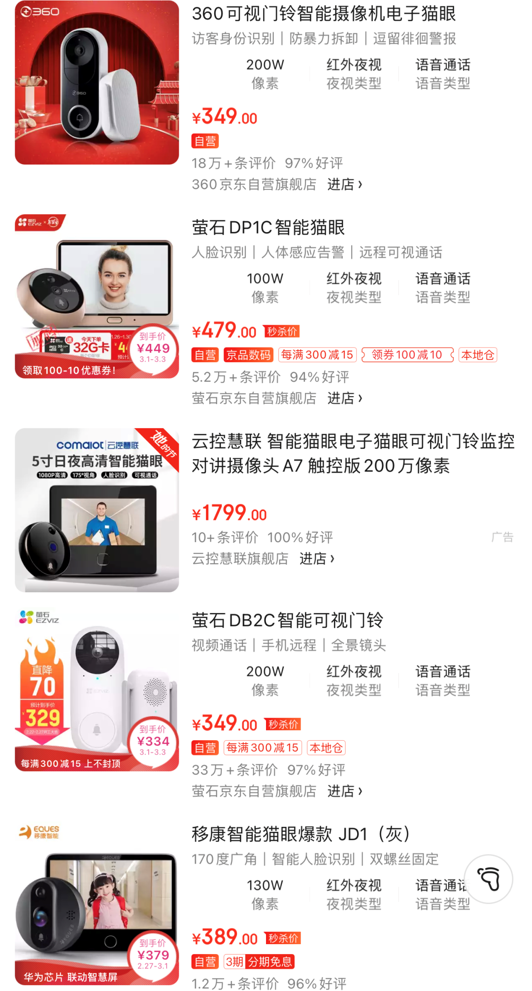 记者在网购平台搜索发现,“电子猫眼摄像头”“智能可视门铃”等产品价格多为数百元,有的还推出“0元电子猫眼被盗险”,还有售价两三千元的智能门锁内嵌监控摄像头,更为隐蔽。多款销量靠前的产品有“监控猫眼,远程看家”“高清夜视,门口漆黑也清晰”“AI人脸识别,随时告知来访者身份”“高清拍摄,云存储”等介绍,并宣称功能仍在不断升级。