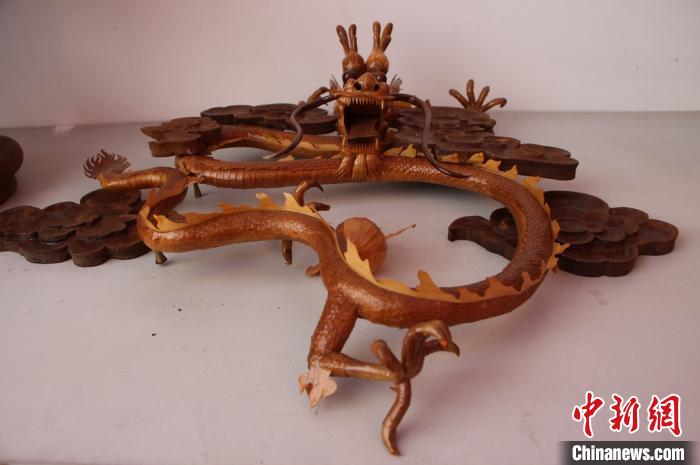 中新网台州3月3日电 (范宇斌 江文辉)长凳上,一把刨刀贴木,或左右推滑,或上下滚皮;与凿刀、锉刀、卷刀及量具、砂纸、手工锯一道,先成型为胚,再镌凿圆弧,打磨滚丝,嫁接木屑,终清漆于上……在浙江省台州市温岭市箬横镇的“50后”民间艺人江于冬手中,木屑剪雕工艺品《双龙抢珠》呼之欲出。