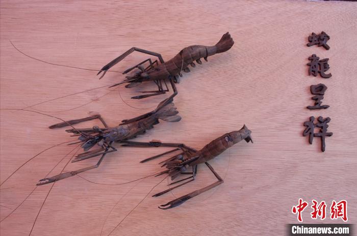 以其近年创作的《龙凤呈祥》木屑剪雕工艺品为例,该作品描述了7只河虾嬉戏的场景。“别看作品不大,但花费了足足有半个月的工时。虾身用楠木进行雕刻的,虾足用红木木屑进行拼接的,虾须用樟木木屑进行嵌接的。特别是虾须,每一根都细如发丝,稍一触摸,整只虾就会略动起来。”他说。