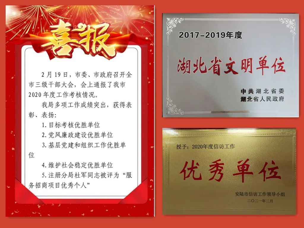 2020年,安陆市市场监督管理局被省委、省政府表彰为“省级文明单位”,被省消委会评为“消费维权先进集体”,被省知识产权局评为“打击知识产权违法百日执法行动业绩突出单位”,被孝感市委、市政府评为“抗击新冠肺炎疫情先进集体”,被安陆市委、市政府评为“目标考核优胜单位”。