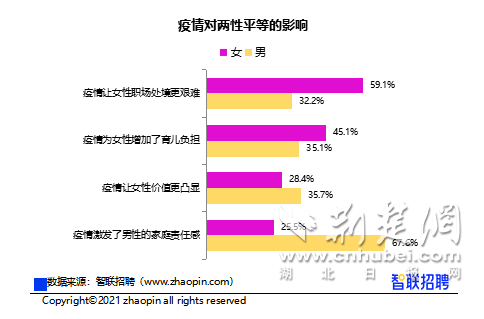 智联招聘调研显示,59.1%的女性受访者表示疫情让女性职场处境更艰难,45.1%认为疫情为女性增加了育儿负担,均远高于男性受访者的认知程度。智联招聘CEO郭盛认为,在育儿问题上,一方面新一代中老年人也更注重提升自身的生活质量,另一方面由于跨省流动异地就业的问题,牺牲自我体验来抚养“隔代人”不再是全民选择,女性育儿的压力从趋势上看还会继续增加。