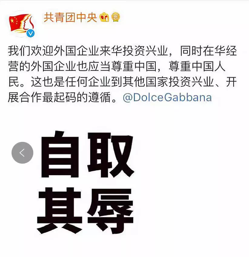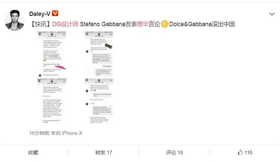 2018年11月21日,国际知名品牌Dolce&Gabbana(杜嘉班纳)设计师还被曝出言辱华的消息,在微博上迅速传开。↓