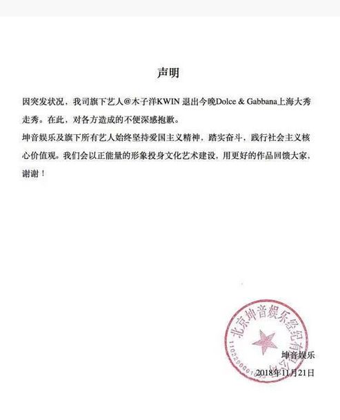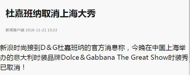 与此同时,因大量模特罢演、明星拒绝出席,D&G原定于2018年11月21日晚,在上海举行的时装秀被取消。