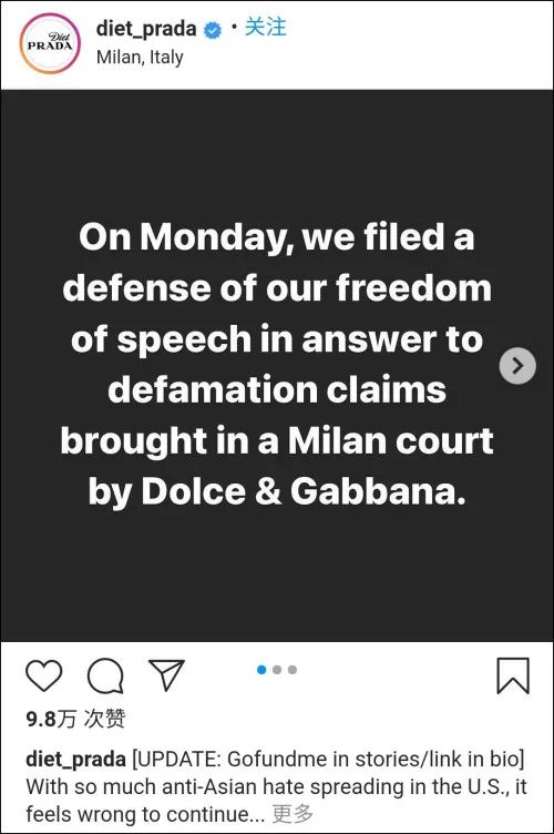 他们首次披露遭D&G起诉源于:“有如此之多的反亚裔仇恨在美国蔓延,我们认为继续对威胁言论自由的诉讼保持沉默是不对的。我们是一家由有色人种共同创立的小公司,一直致力于在社区里大声反对种族主义……我们把Diet Prada培养成一个平台,让我们可以谴责种族主义,放大更多来自BIPOC社区的故事,并让时尚行业遵循更高的道德标准。”