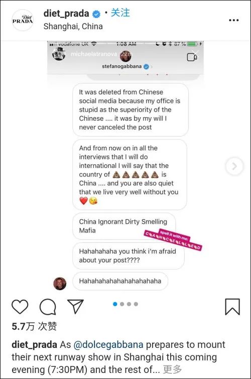 D&G创始人之一Stefano Gabbana随后在回复网友的质疑时进行了否认。不过他的发言却使用到大量的辱华词汇,在网友看来,这更进一步坐实了D&G“确实存在着辱华的企业文化”。Diet Prada就是较早曝光不当发言并参与到网络论战中的机构之一。