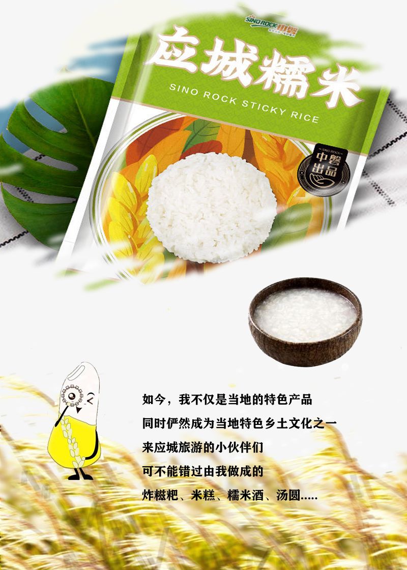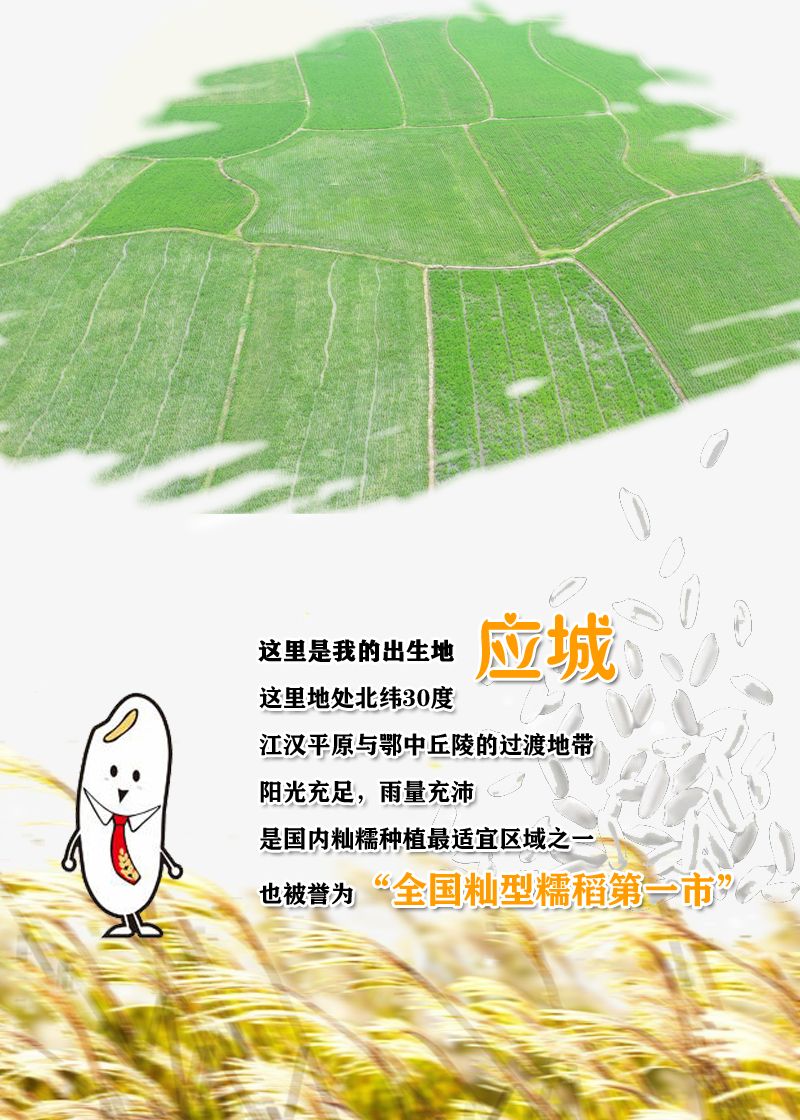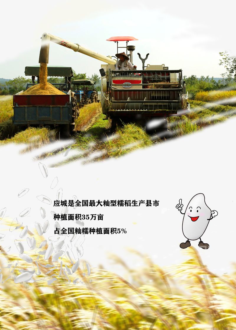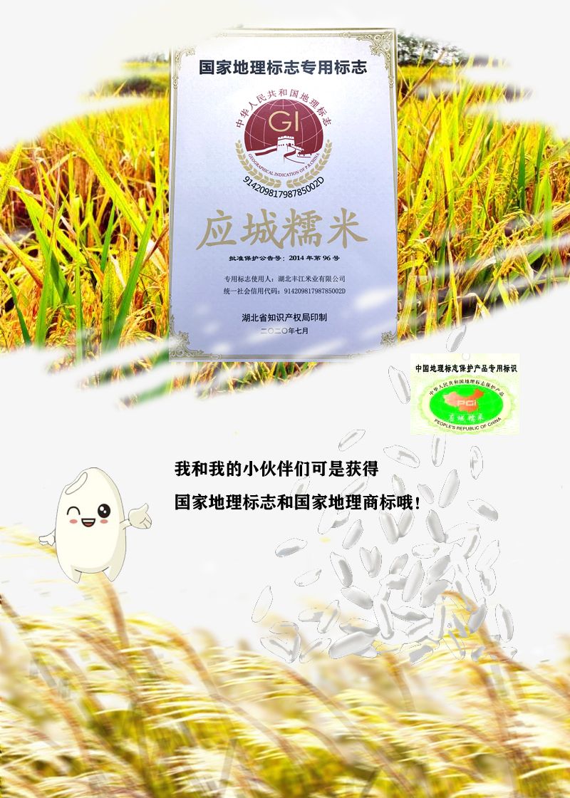应城市是全国最大的籼糯稻生产县市之一。由于独特的品质,“应城糯米”先后获得了国家地理标志保护产品和国家地理标志证明商标2大国家级品牌。