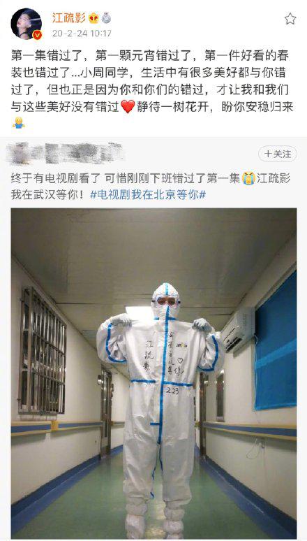据悉,2020年2月24日,在武汉勇敢抗疫的护士小周在微博晒出自己在防护服上写下的“江疏影,我在武汉等你”的字样,得到了江疏影的回复。3月8日,江疏影武汉参加活动,终于与这位粉丝见面了,履行了当时的约定。