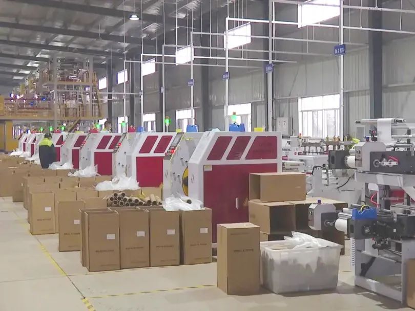 走进缓冲包装生产车间,10台吹膜机正在上料、压膜、收卷,再经过制袋机热封、分切,一筒筒气柱袋的卷料逐渐成型。