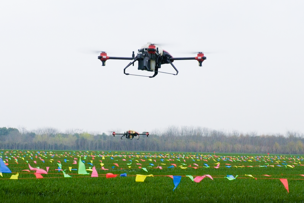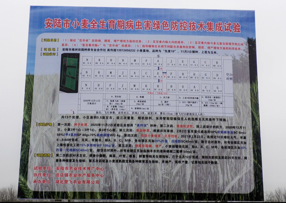 在安陆市巡店镇沙洲村小麦病虫害全程绿色防控技术、防治工程集成示范基地,4台无人机正在向麦田喷洒农药