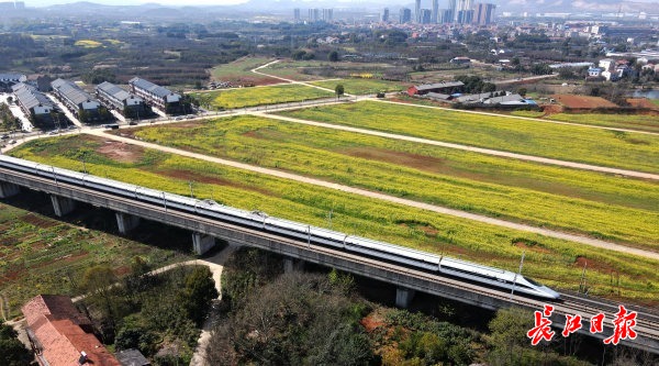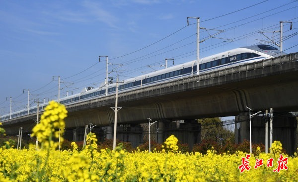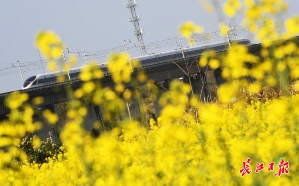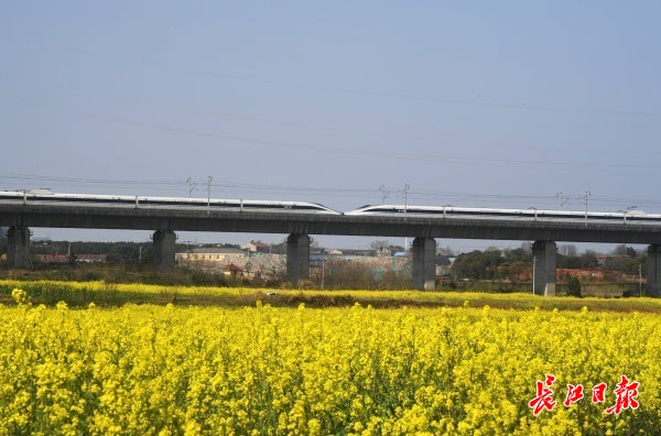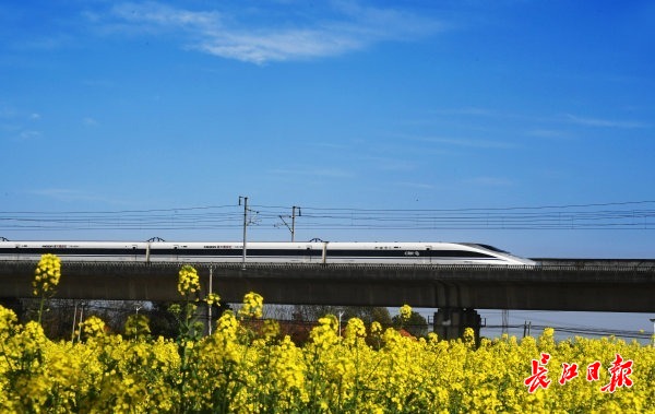 长江网3月14日讯 3月14日,武汉春暖花开,阳光明媚。在江夏五里界京广高铁高架桥上,一列高铁动车组在油菜花海中飞驰而过。行驶的列车,金色的花海,构成一幅美丽和谐的画卷。