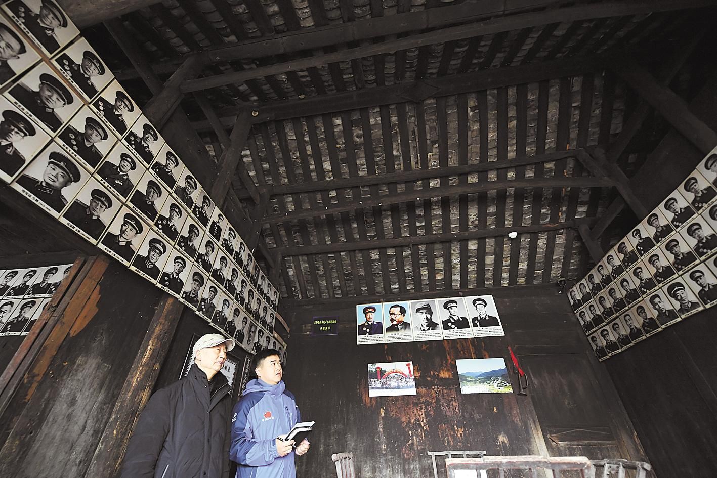忠堡大捷临时指挥部旧址,整齐悬挂着贺龙等一百七十三位元帅、将军的照片。