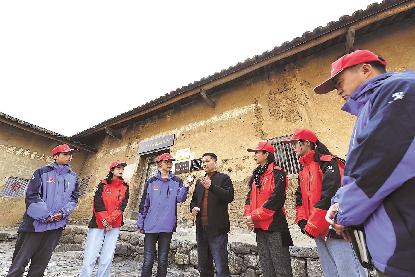 在郧西县丁家坪村红二十五军223团政治部旧址,00后大学生聆听红军转战当地的故事。