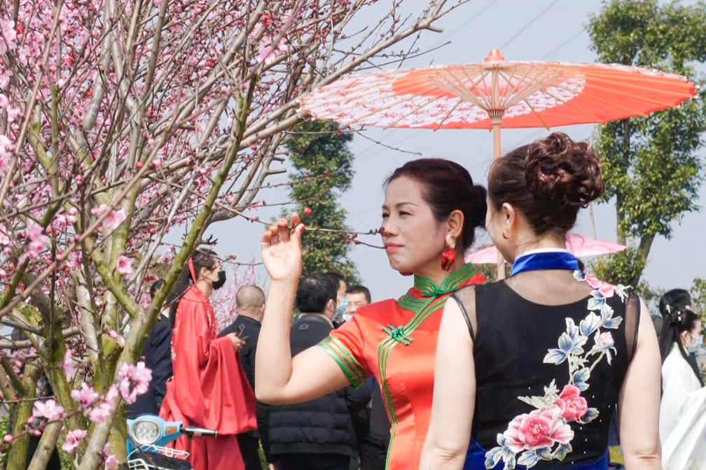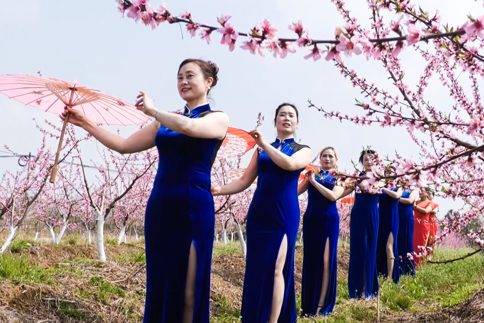 看,桃花林中旗袍秀队伍组成了一道靓丽的风景线,风华倩影与灿烂春色相映成趣。