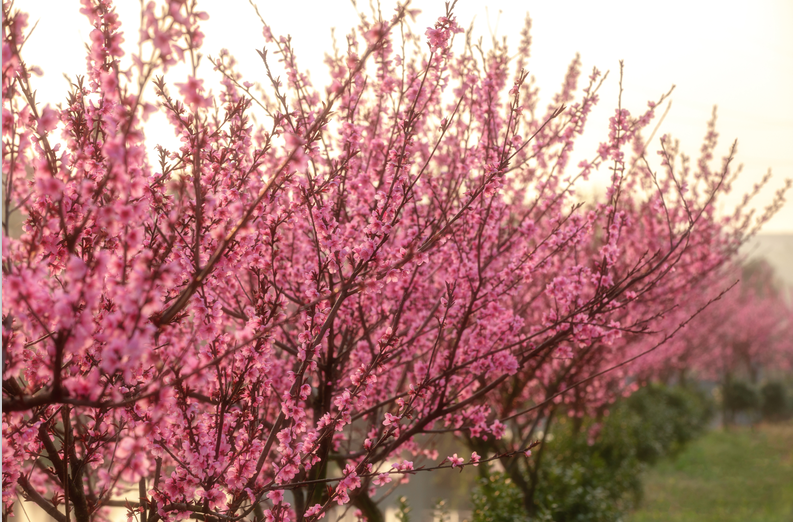 枝头叶子舒展身段,花苞吐露,竞相开放,一时间,春意枝头俏,桃花灼灼开。