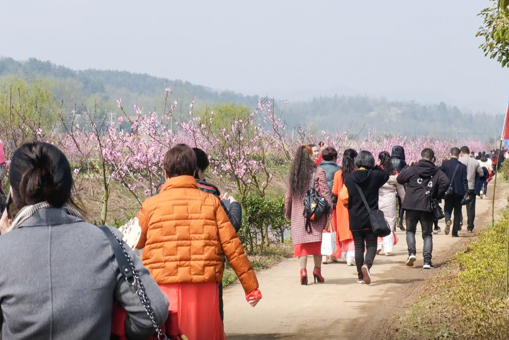 来自五湖四海的游客们赏花看景品民俗,嬉戏游乐思乡愁,共赏桃花溪水两岸的明媚春光。
