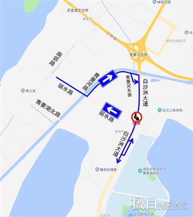3、原由青菱片区通过丽水路往白沙洲大道方向车辆,需绕行青菱河路至白沙洲大道;通过白沙洲大道往北向中心城区方向车辆,需沿白沙洲大道驶过丽水路路口后,在下一掉头点掉头。