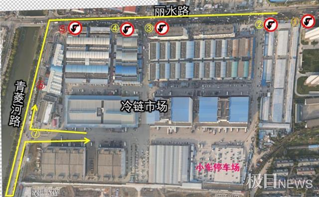 5、冷链市场位于丽水路的1号门、2号门、3号门、4号门、5号门禁止车辆驶入,仅允许车辆驶出,进入冷链市场车辆一律通过位于青菱河路的6号门、7号门驶入。