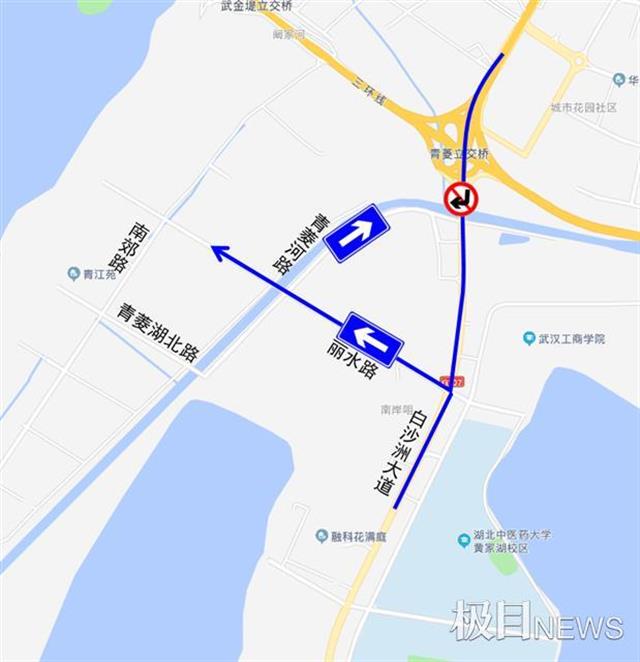 1、原由白沙洲大道往西通过青菱河路进入青菱片区车辆,可通过白沙洲大道、丽水路绕行。