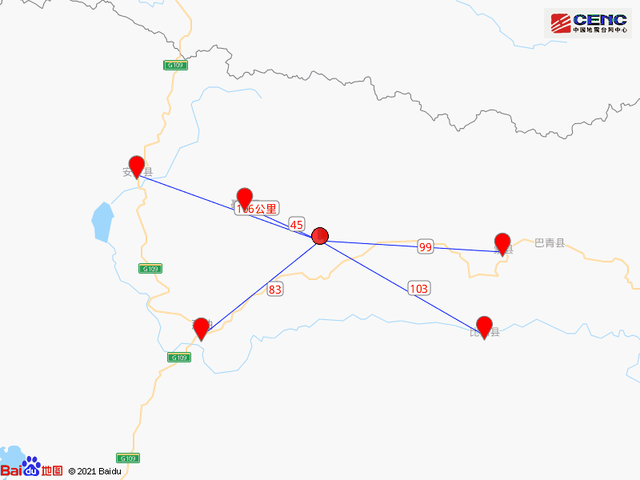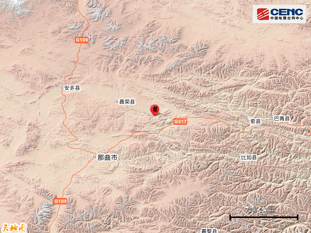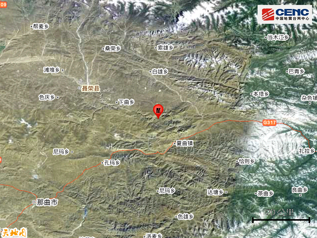 震中距聂荣县45公里、距那曲县83公里、距索县99公里、距比如县103公里、距安多县106公里,距那曲地区83公里,距拉萨市299公里。
