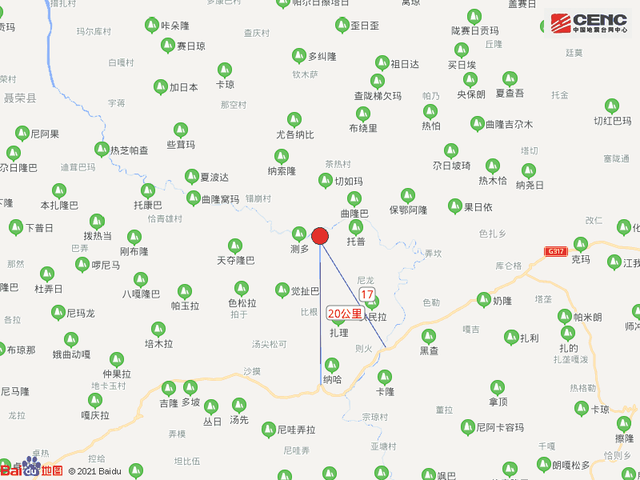 本次地震周边5公里内的村庄有沙欠、我罗布兄、八嘎而、克列,20公里内的乡镇有夏曲镇、达前乡。