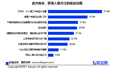 调研中,呼吁监管996、大小周工作制度的提案发布后激发职场人对过劳现象的声讨,57.4%受访者表示关注。此外,41.8%关心提高个税起征点的问题,“不得拒绝录取女性或提高对女性的录取标准”与“延迟退休”也均获得超过3成的关注。