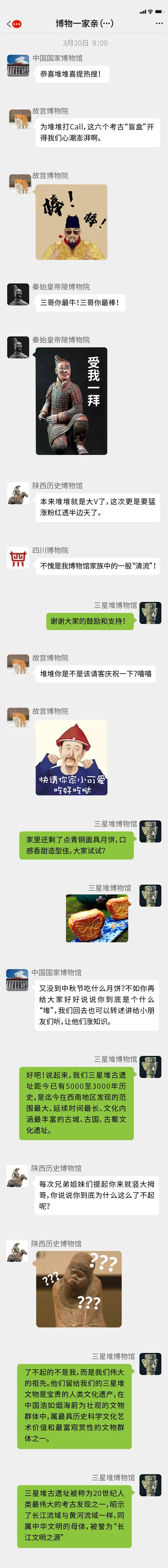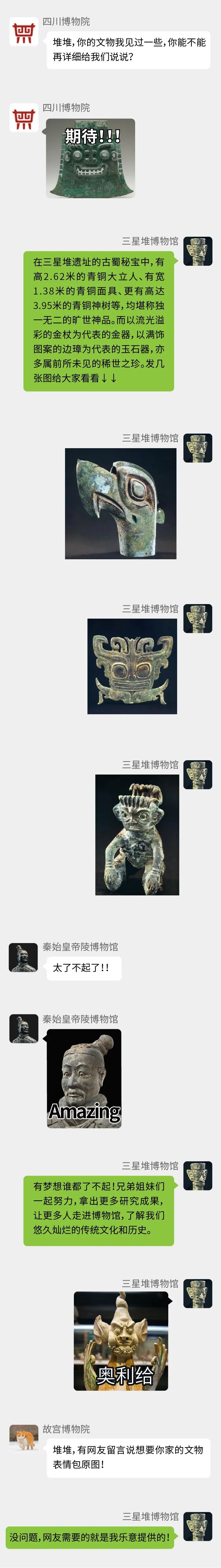 面对这样的大喜事,我们不禁脑洞大开,假想中国各大博物馆和其代表性文物都像《博物馆奇妙夜》中一样拥有了生命和开口说话的能力,再把它们拉进同一个微信群,群里将会是怎样一番有趣又热闹的场景?它们将如何讨论今天三星堆公布的考古大发现?