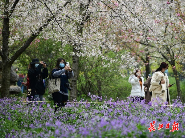 虽然武汉前期经历了长时间降雨天气,但是今年的樱花似乎比以往更加“坚强”,风雨之后仍然生机勃勃绽放在枝头,一眼望去,整座东湖樱花园一片浪漫粉,中樱依然、晚樱盛开。园内,身穿汉服、旗袍的游客在樱花树下拍照、舞蹈,享受着春日周末时光。举家出游的、情侣约会的、公司团建的、闺蜜结伴的……下午时分,东湖樱花园内人潮涌动,每个人都在这里发生着独属于自己的春日限定故事。