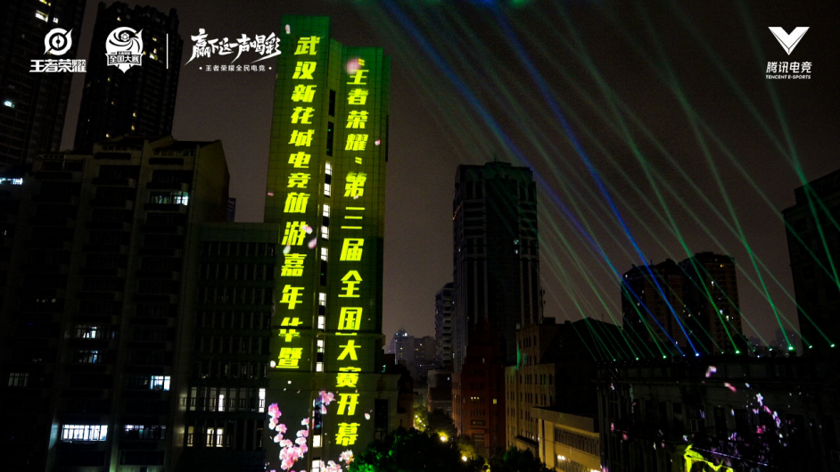 灯光秀的内容由王者人物动画、光影樱花、倒计时等元素共同组成,结合最新光影数字技术所打造的潮流灯光秀,将王者荣耀全国大赛的Logo投射在武汉的夜幕中,照亮了每一位到场的武汉市民的眼眸,正式宣布武汉新花城旅游电竞嘉年华暨“王者荣耀”第三届全国大赛开幕。