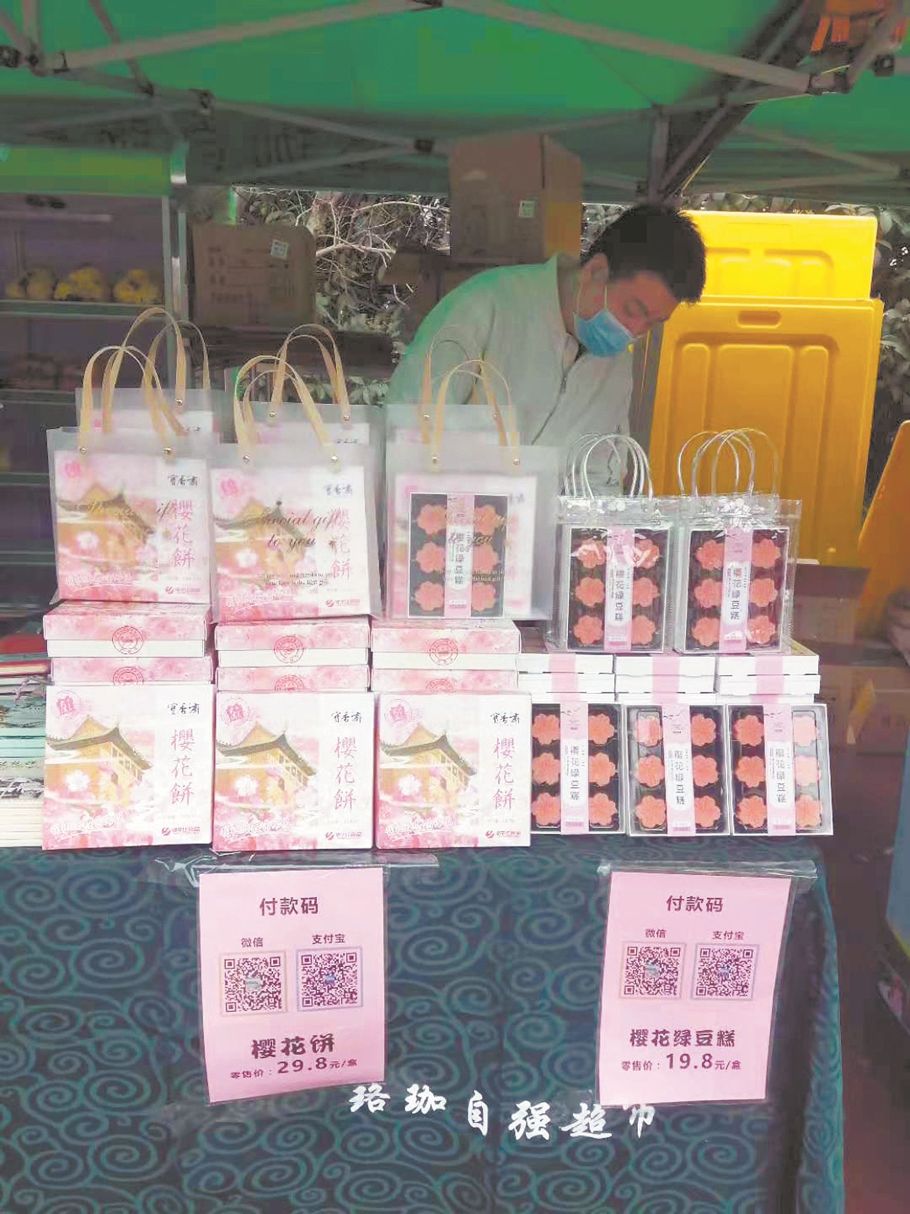 “在武汉大学赏樱花,边赏边吃樱花绿豆糕,满满都是武汉的味道。”3月21日,在武汉大学第五教学楼的外广场上,游客丁女士在本土老字号扬子江食品的摊位上买了两盒樱花绿豆糕,准备与友人一起带到樱花大道上,在拍照留念之后,一边吃樱花糕饼,一边赏樱花美景:“美景和美食都不辜负,这样更有赏樱的武汉特色。”