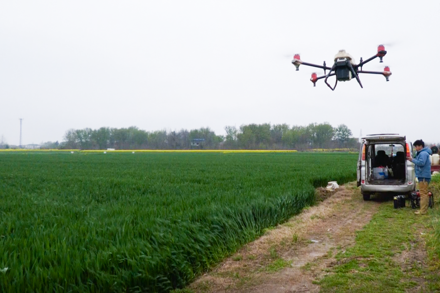 无人机给麦地喷洒药剂 陈玉莹摄