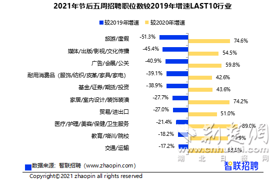2021年节后五周招聘职位数较2019年增速TOP10行业