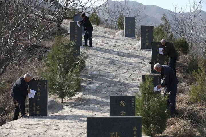 几位老人正在擦拭烈士墓碑(3月27日摄)。新华社记者原勋摄