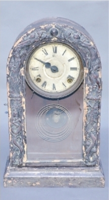 座钟为铁、木质地,重2.84公斤。座钟上部为椭圆形,下部为长方形。钟面白底已泛黄,时针缺损,用罗马数字标示时刻。座钟四周涂有黑色油漆,有红木云龙浮雕饰边。